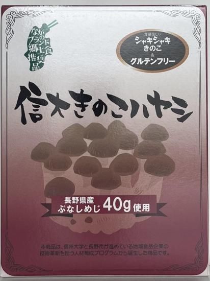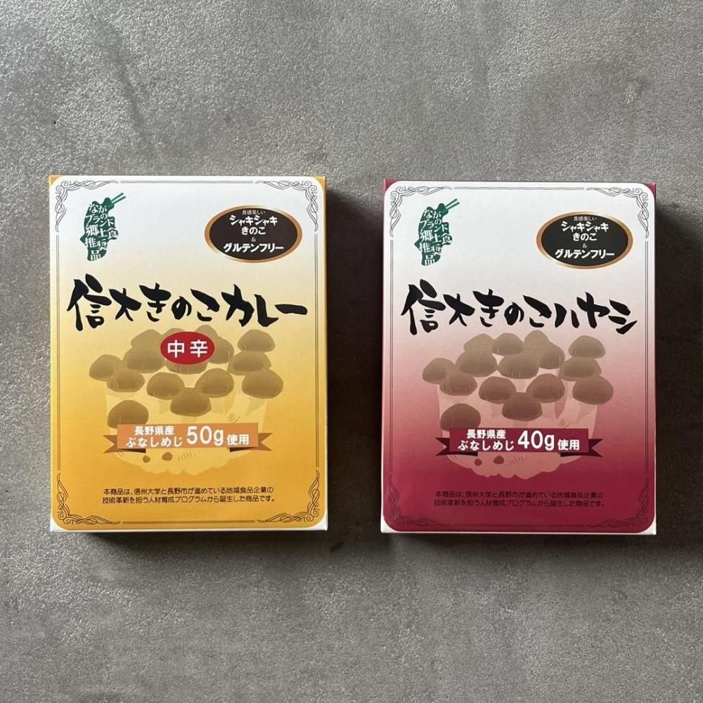 きのこの有数の生産地である長野県で生産されたぶなしめじ50g使用し、歯ごたえと旨味を残した、オリジナルブレンドの信州大学発のきのこカレーと、同じくきのこの有数の生産地である長野県で生産されたぶなしめじ40g使用し、歯ごたえと旨味を残し、トマトのコクと酸味を生かした深みのある信州大学発のきのこハヤシです。