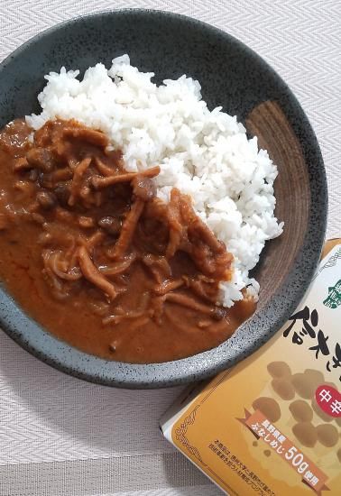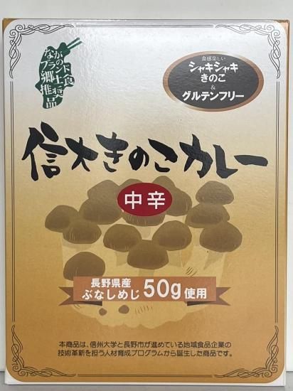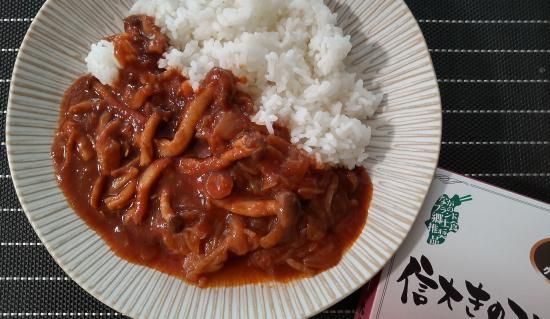 原材料:ぶなしめじ(長野県産)、玉ねぎ(国産)、りんごピューレ、オニオンソテー、トマトペースト、チャツネ、豚脂、じゃがいも、にんじん、カレー粉、 香辛料、ココナッツミルクパウダー、ローストオニオンペースト、ガーリックペースト、酵母エキス、食塩、食用植物